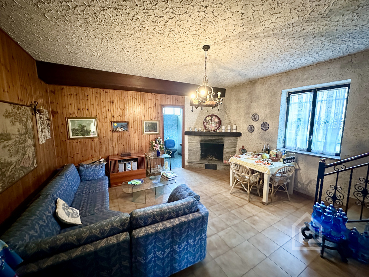 Internamente al primo piano è composta da ingresso, soggiorno con camino a legna, sala da pranzo, cucinino, due camere e bagno.